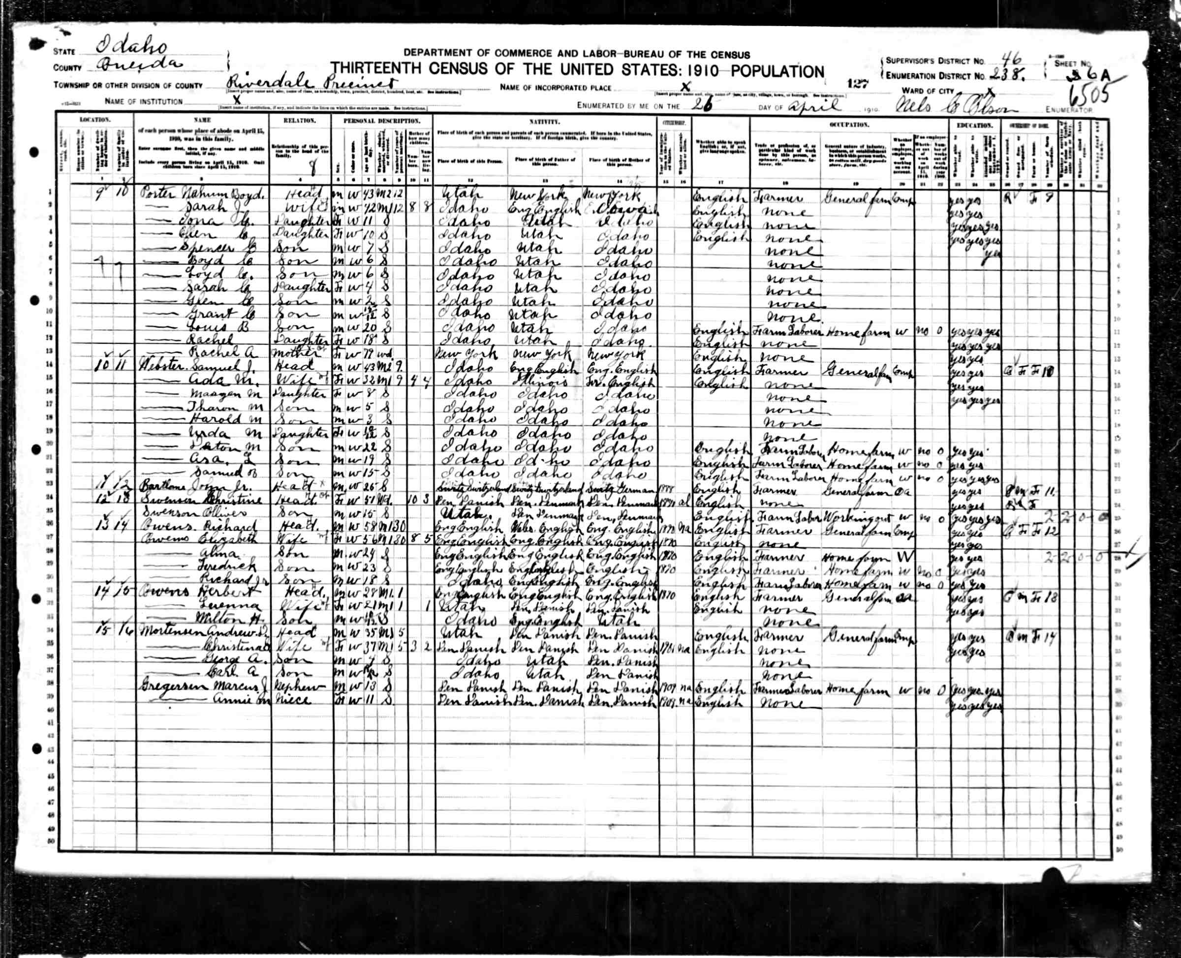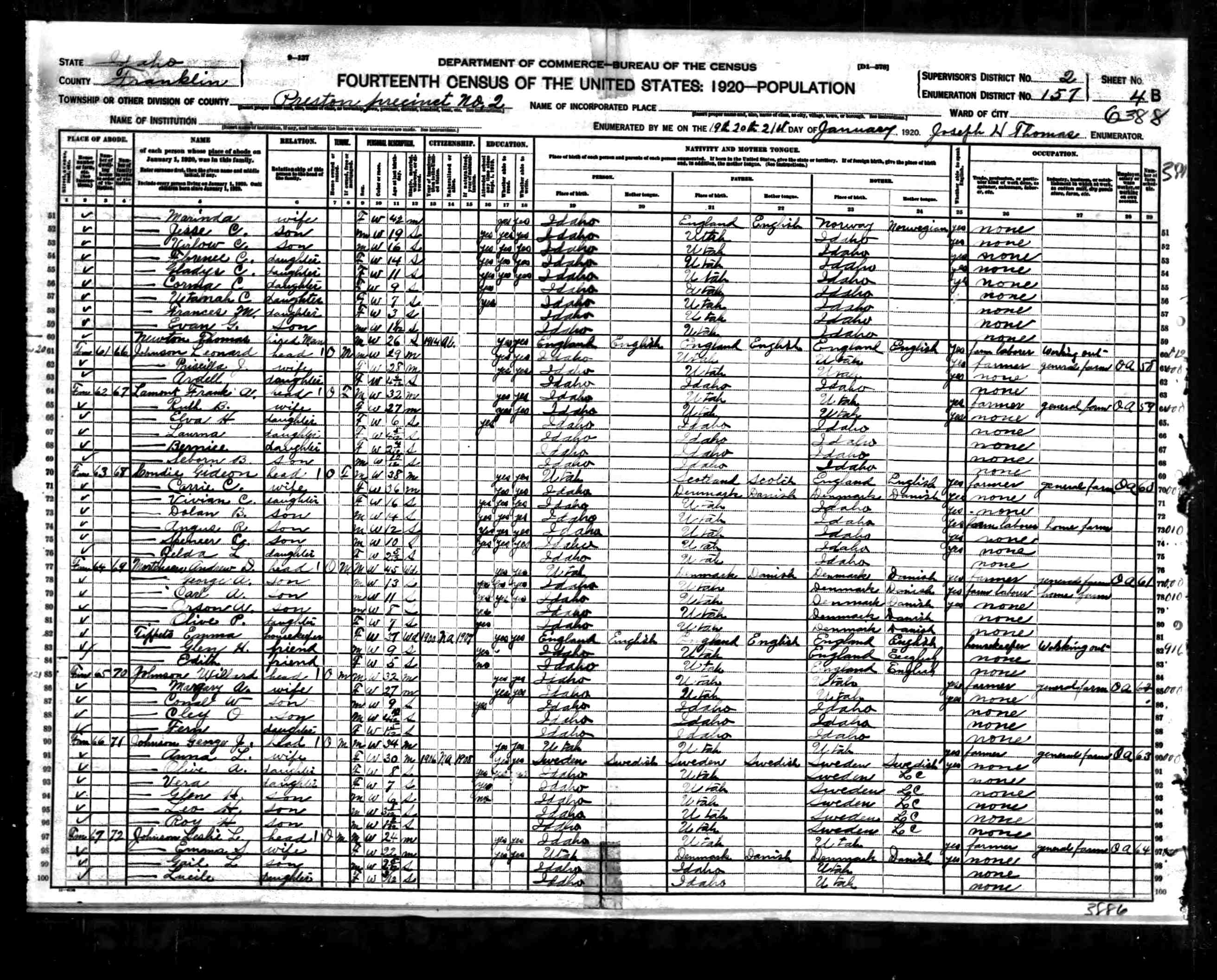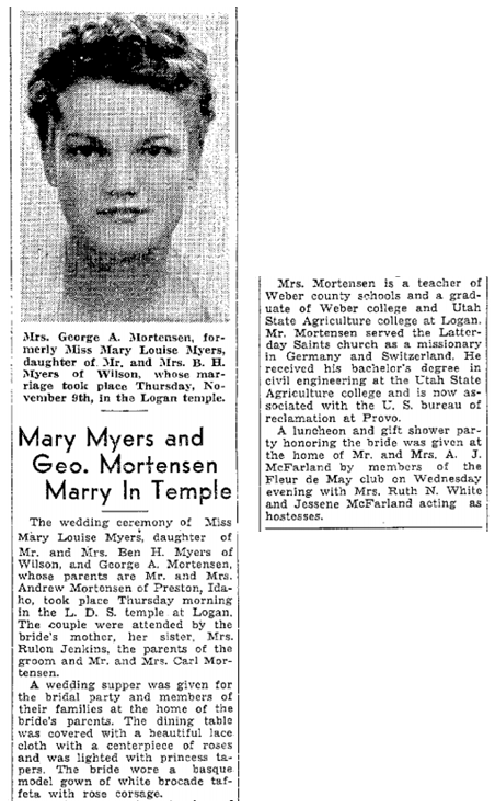 George Andrew Mortensen, son of Andrew Daniel Mortensen and Christina Lauritz Gregersen, was born on 24 February 1906 in Glendale, Franklin, Idaho. George married Mary Louise Myers on 9 November 1939. George died 30 June 1990 in Idaho Falls, Bonneville, Idaho, and is buried in Preston Idaho.